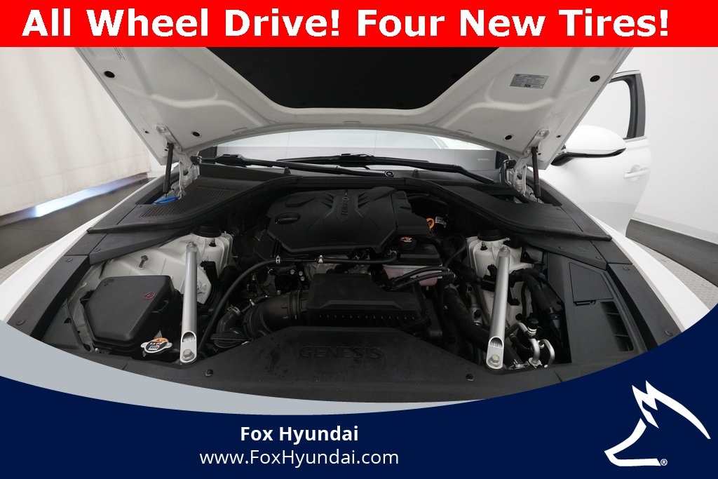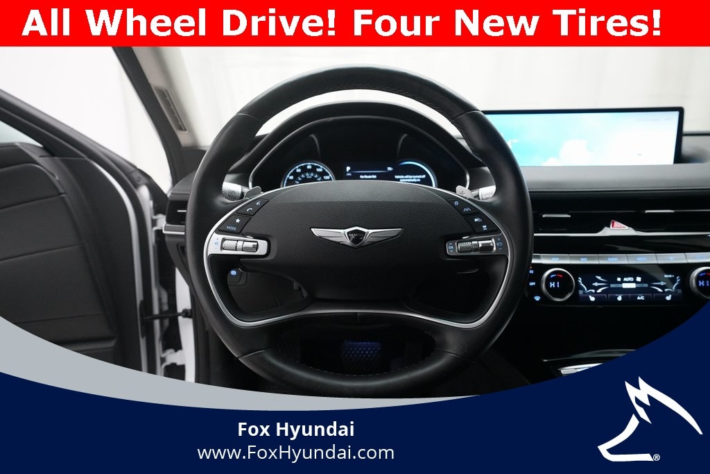 12 Speakers, 4-Wheel Disc Brakes, ABS Brakes, Air Conditioning, Alloy wheels, AM/FM Radio, Available Sirius XM Radio, Android Auto & Apple CarPlay, Anti-whiplash front head restraints, Auto High-beam Headlights, Auto tilt-away steering wheel, Auto-dimming door mirrors, Auto-dimming Rear-View mirror, Automatic temperature control, Bumpers: body-color, Compass, Delay-off headlights, Driver door bin, Driver vanity mirror, Dual front impact airbags, Dual front side impact airbags, Dual-Climate Control, Electronic Stability Control, Emergency communication system: Genesis Connected Services, Four wheel independent suspension, Front anti-roll bar, Front Bucket Seats, Front Center Armrest, Front reading lights, Fully Automatic Headlights, Garage door transmitter: HomeLink, Heated Front Bucket Seats, Heated Front Seats, Heated Rear Seats, Heated Sideview Mirrors, Heated Steering Wheel, Illuminated Entry, Knee airbag, Leather steering wheel, Leatherette Seating Surfaces, Low Tire Pressure Warning, Memory seat, Navigation System, Occupant sensing airbag, Option Group 01, Outside Temperature Display, Overhead airbag, Overhead console, Panic Alarm, Passenger door bin, Passenger vanity mirror, Power Adjusting Driver Seat, Power door mirrors, Power passenger seat, Power steering, Power Windows, Radio data system, Radio: AM/FM/HD/SiriusXM Audio System, Rain Sensing Wipers, Rear anti-roll bar, Rear reading lights, Rear seat center armrest, Rear side impact airbag, Rear-View Camera, Rear/Front Window Defroster, Remote Keyless Entry, Security System, Speed control, Speed-sensing steering, Speed-Sensitive Wipers, Steering wheel memory, Steering Wheel Mounted Controls, Tachometer, Telescoping steering wheel, Tilt steering wheel, Traction Control, Trip computer, Turn Signal Indicator Mirrors, Variably intermittent wipers, Wheels: 18"x8.0J Alloy.