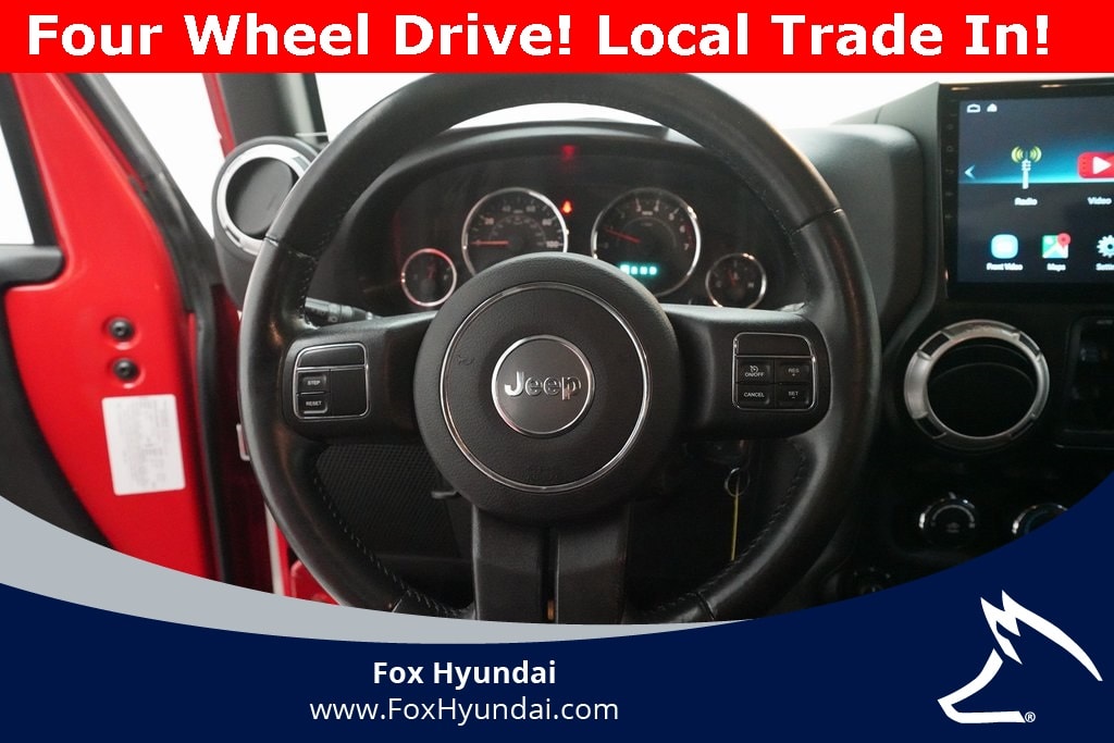 18" x 7.5" 7-Spoke Polished Aluminum Wheels, 18" x 7.5" Polished Satin Carbon Wheels, 3.21 Rear Axle Ratio, 4-Wheel Disc Brakes, 40GB Hard Drive w/28GB Available, 5-Year SIRIUSXM Travel Link Service, 6.5" Touch Screen Display, 8 Speakers, ABS Brakes, Air Conditioning, Alloy wheels, AM/FM Radio, Anti-Spin Differential Rear Axle, Audio Jack Input for Mobile Devices, Auto-dimming Rear-View mirror, Brake Assist, CD/MP3 Player, Class II Receiver Hitch, Cloth Bucket Seats, Compass, Driver door bin, Driver vanity mirror, Dual front impact airbags, Electronic Stability Control, Front anti-roll bar, Front Bucket Seats, Front Center Armrest w/Storage, Front Fog Lights, Front reading lights, Fully Automatic Headlights, GPS Navigation, Heated Sideview Mirrors, Heavy Duty Suspension w/Gas Shocks, Illuminated Entry, Integrated roll-over protection, Leather steering wheel, Leather Wrapped Steering Wheel, Low Tire Pressure Warning, Occupant sensing airbag, Outside Temperature Display, Panic Alarm, Passenger door bin, Passenger vanity mirror, Power door mirrors, Power steering, Power Windows, Quick Order Package 24G, Radio data system, Radio: Uconnect 130 AM/FM/CD/MP3, Radio: Uconnect 430N CD/DVD/MP3/HDD/NAV, Rear anti-roll bar, Remote Keyless Entry, Remote Start System, Remote USB Port, Security System, SIRIUSXM Travel Link, Speed control, Split Folding Rear Seat, Steering Wheel Mounted Controls, Sunrider Soft Top, Tachometer, Tilt steering wheel, Traction Control, Trailer Tow Group, Trailer Tow w/4-Pin Connector Wiring, Trip computer, Variably intermittent wipers.