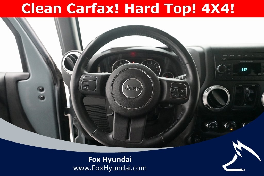 18" x 7.5" Polished Satin Carbon Wheels, 3.21 Rear Axle Ratio, 4-Wheel Disc Brakes, 8 Speakers, ABS Brakes, Air Conditioning, Air Conditioning w/Auto Temperature Control, Air Filtering, Alloy wheels, AM/FM Radio, Audio Jack Input for Mobile Devices, Auto-dimming Rear-View mirror, Black 3-Piece Hard Top, Brake Assist, CD/MP3 Player, Cloth Bucket Seats, Compass, Delete Sunrider Soft Top, Driver door bin, Driver vanity mirror, Dual front impact airbags, Electronic Stability Control, Freedom Panel Storage Bag, Front anti-roll bar, Front Bucket Seats, Front Center Armrest w/Storage, Front Fog Lights, Front reading lights, Fully Automatic Headlights, Heated Sideview Mirrors, Heavy Duty Suspension w/Gas Shocks, Humidity Sensor, Illuminated Entry, Integrated roll-over protection, Leather steering wheel, Leather Wrapped Steering Wheel, Low Tire Pressure Warning, Occupant sensing airbag, Outside Temperature Display, Panic Alarm, Passenger door bin, Passenger vanity mirror, Power door mirrors, Power steering, Power Windows, Quick Order Package 24G, Radio data system, Radio: Uconnect 130 AM/FM/CD/MP3, Rear anti-roll bar, Rear Window Defroster, Rear Window Wiper/Washer, Remote Keyless Entry, Remote Start System, Security System, Speed control, Split Folding Rear Seat, Steering Wheel Mounted Controls, Sunrider Soft Top, Tachometer, Tilt steering wheel, Traction Control, Trip computer, Variably intermittent wipers.